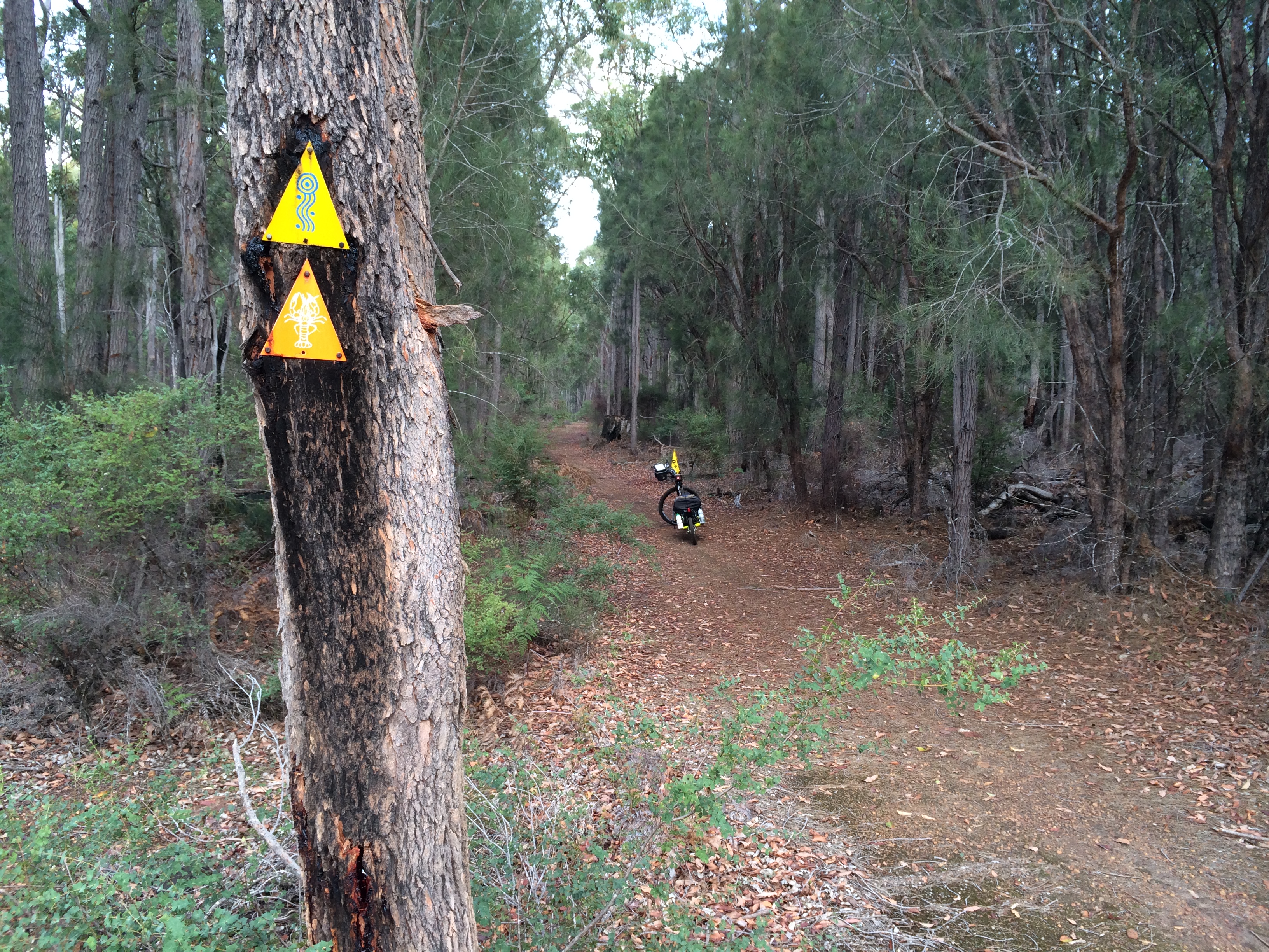 It was a cold start - 1 degree at 7am, but the forecast was for dry weather. I was on the road by 6.45am, and due to the early start and school holidays, I was in Waroona just after 8am for a coffee. I had a short drive to the Lake Navarino Forest Resort and had a quick look around before hitting the trail at 8.45am. I joined the Trail about 400 m away at the Dam. It was a cold ride down that short steep hill. But the uphill from Samson Brook, only 5 km in, had me sweating. I had to walk some of that - it was steep and long.