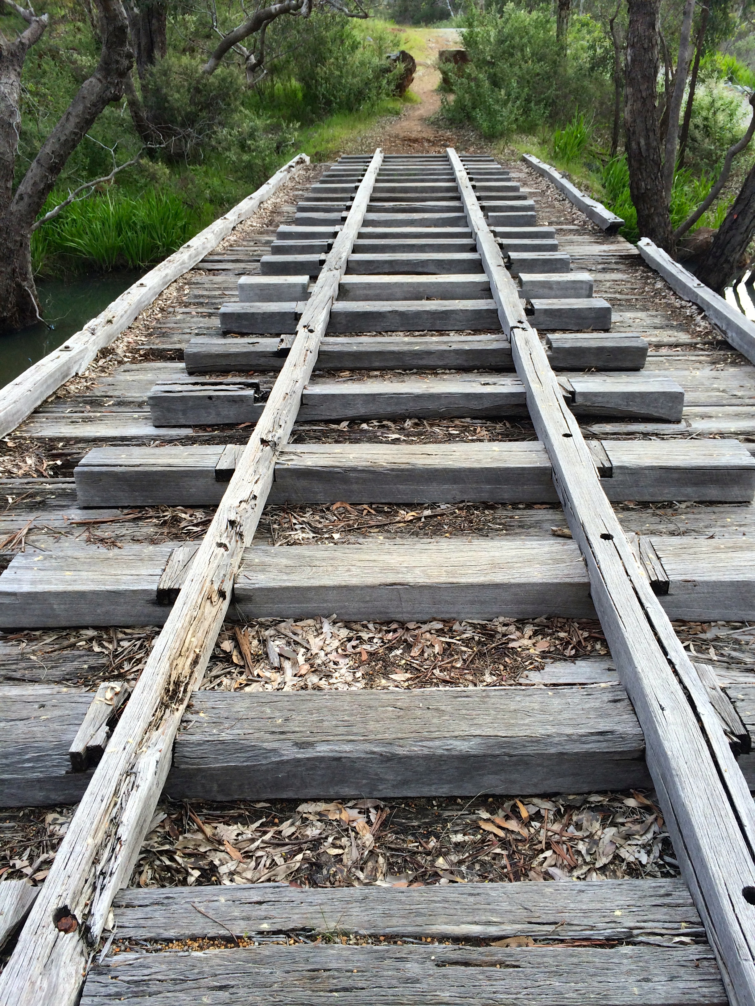 Within another 100m, I saw a nice granite out crop on the right.After 500m of smooth old form that you would feel comfortable driving your Mum's car down the trail become rocky with steep down hill sections. There were nice views on right, including a little water fall. The trail improved bit and I noticed an old fence on right and some cleared land. Rocky rough steep down hill. But the last couple of hundred metres was steep and rough with decent size loose rocks so I walked it down. I think the photos show that! But once you cross gravel road with the rail bridge in front of you, it is all easy from then on. Obviously I stopped at the rail bridge for a look - it was quite pretty in the afternoon sun with the water around it.