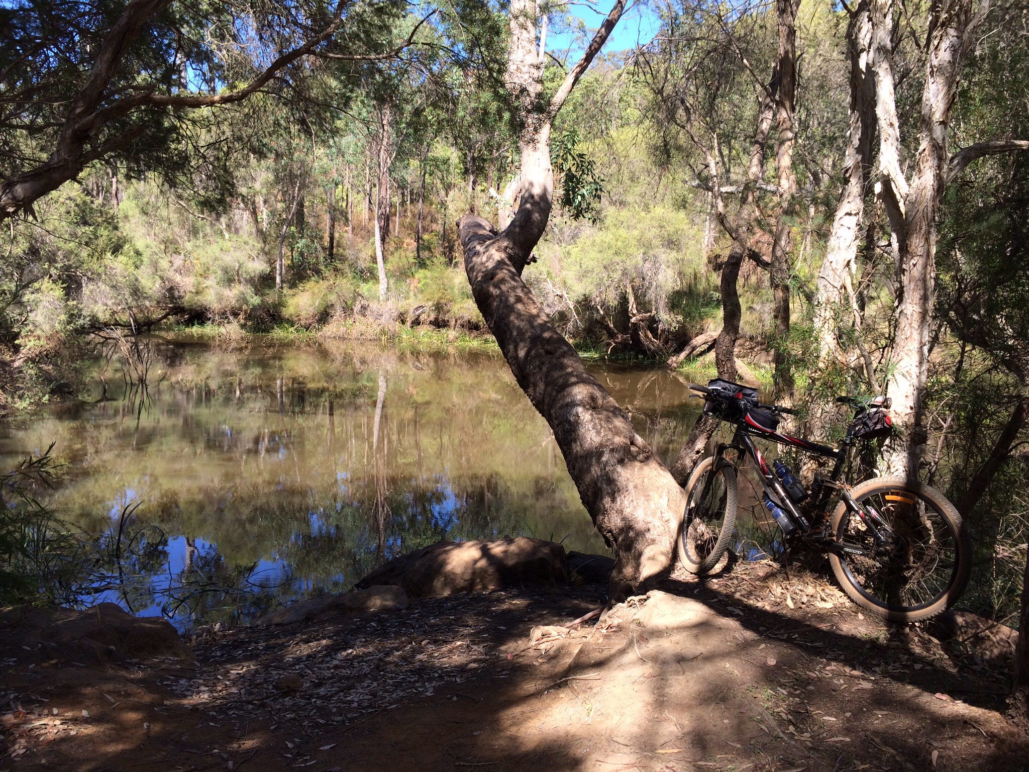 Soon you cross the Mundaring/Kalgoorlie pipeline and follow along next to it to the Mundaring Weir hotel. There is a short section of very steep down hill as you go past the pub - it can be scarily fast if you are fully loaded. You then turn left on the Mundaring Weir Rd downhill for a km or 2 - that can be pretty quick too. Turning off on the Pipeline track you basically follow the pipeline but usually on nice single track without following the hills that the pipeline goes over. As you cross the Helena River there is a little pool to stop and prepare for the uphill section.