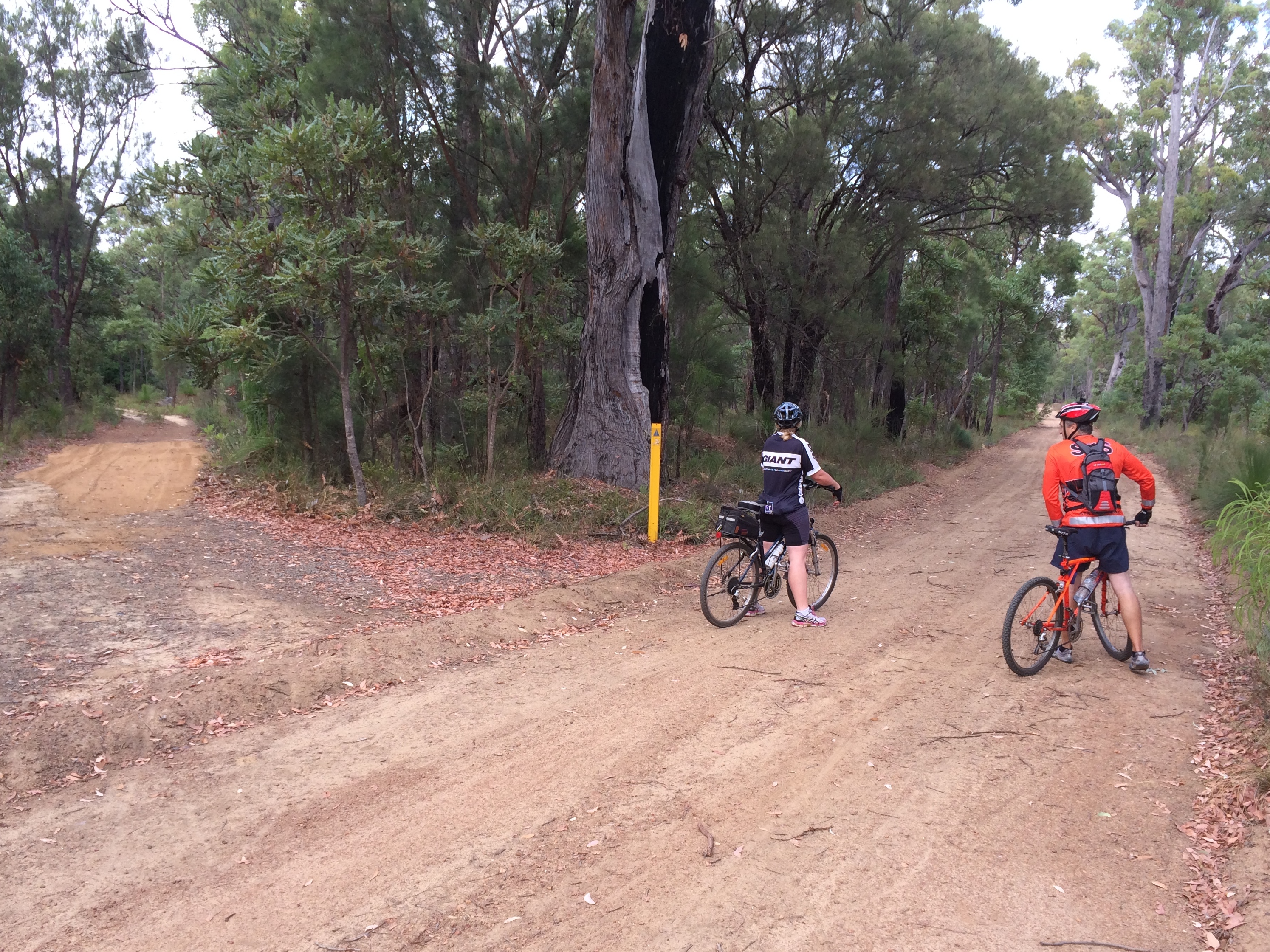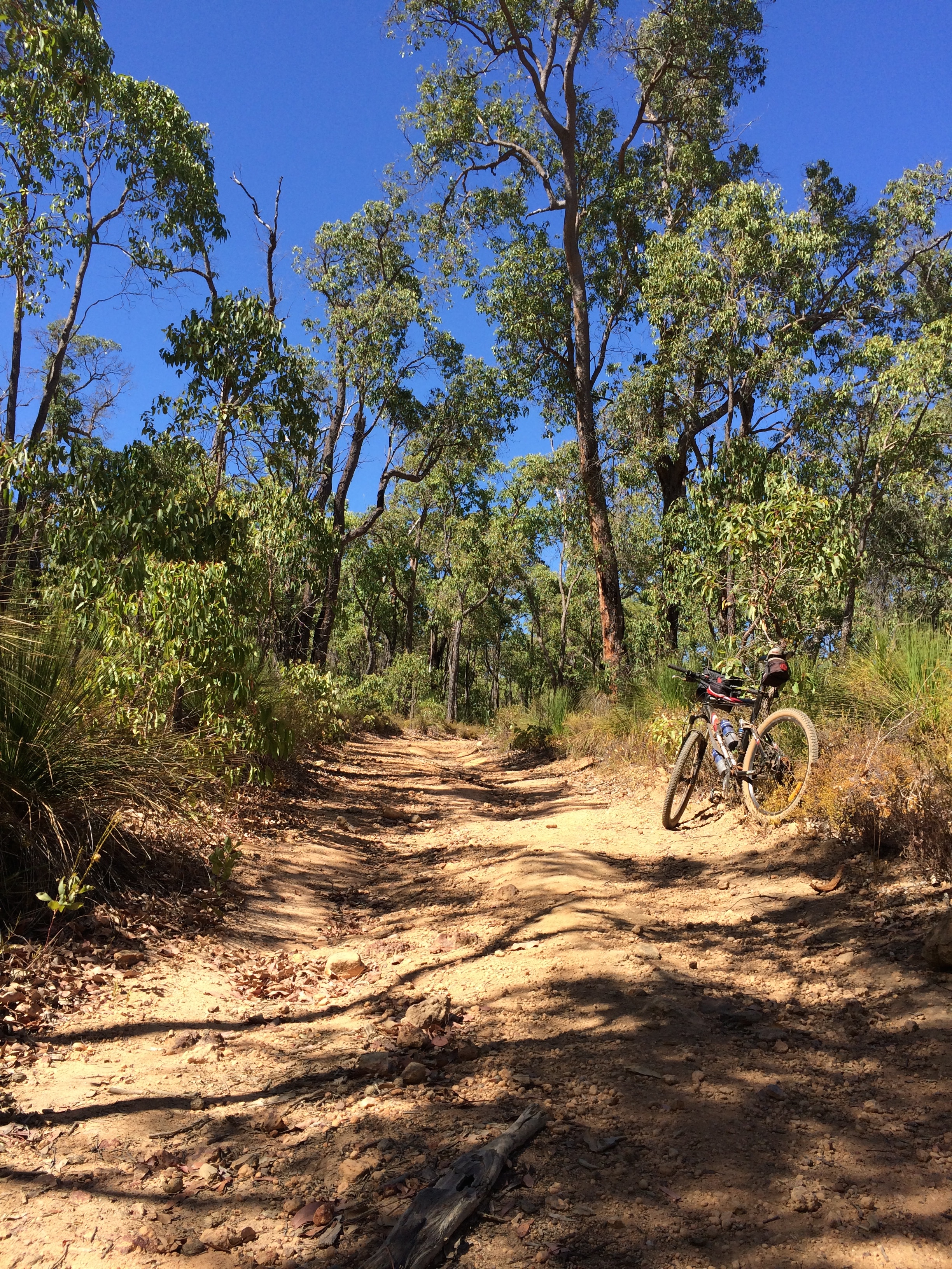 There is a big rough 800m down hill section about 21km from Carinyah. It is steep with big water carved wash outs in it. It was so steep and rough I walked down half of it. That reminded me of a mate who rode up this hill on a 20 year old rigid MTB (no suspension at all) with panniers on - respect Richo!
