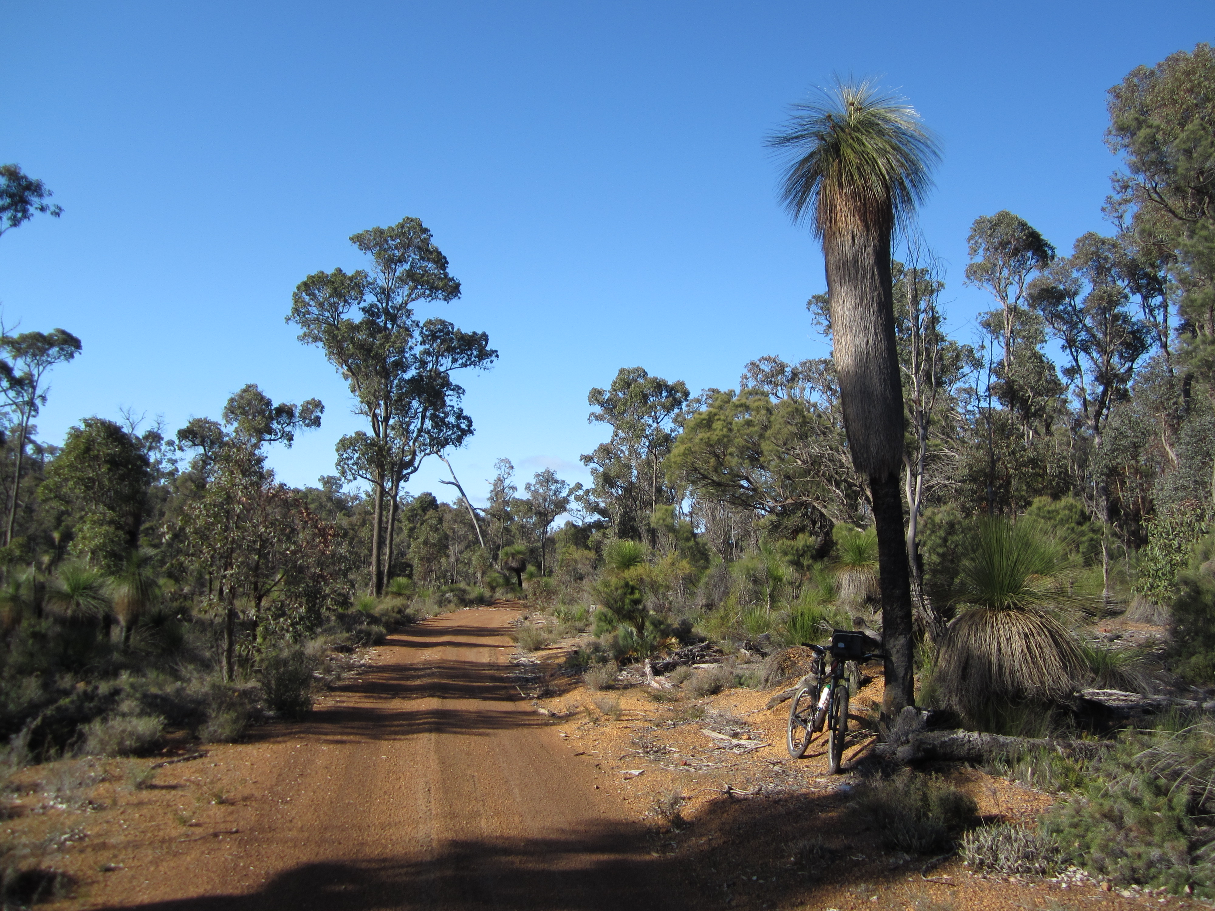 I met two English cyclists who were riding all the way to Albany. They said there was ice at Wungong hut this morning and they had been very cold. They were riding touring bikes with fairly smooth tyres, front and rear panniers and drop handle bars, which is a set up I would not use. They had already had one "off" but I assured them it would get better after Dwellingup.