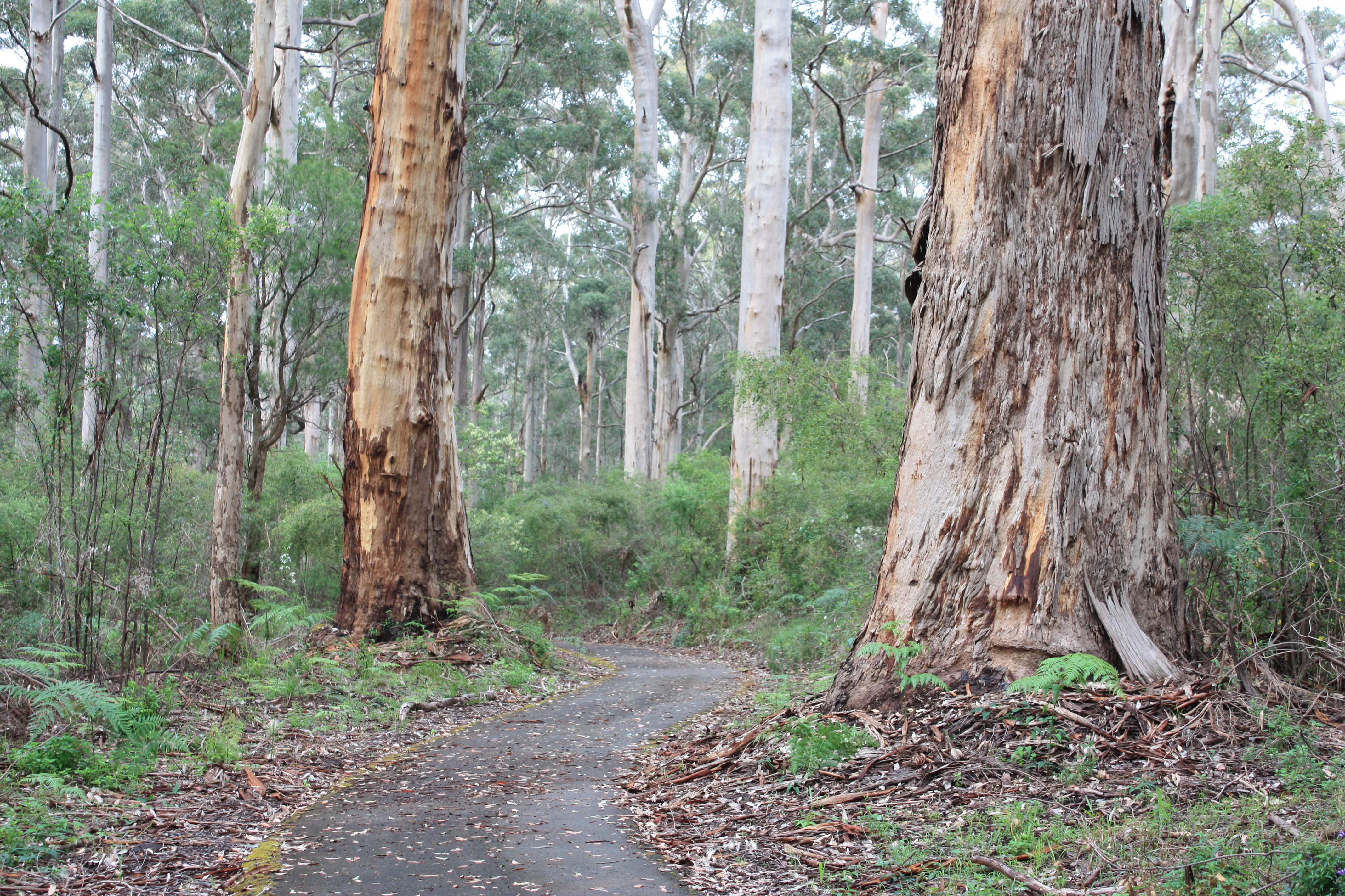 The first 25 km from Pemberton to Northcliffe was all under karri and jarrah forrest, often on old form, or on good, quiet dirt roads. It was great. The old form following Spring Gully is especially nice - a stream on one side and lots of shade under the big trees. There is also lots of signs of the old railway - occasional sleepers, I even saw a rail nail, some cuttings etc. The only drama was I just missed a dugite (a poisonous snake) by a metre, so from then on the stick strewn form suddenly seemed to be full of snakes! I did see another one later lying in the middle of a trail later- I did an emergency stop about 2 metres from it, but luckily it left in the opposite direction. There were a couple of hills I walked up, mainly to stretch my legs out. I also saw a small bandicoot just after a 1080 fox baiting sign, so Western Shield must be working (see more under "What you will see").
